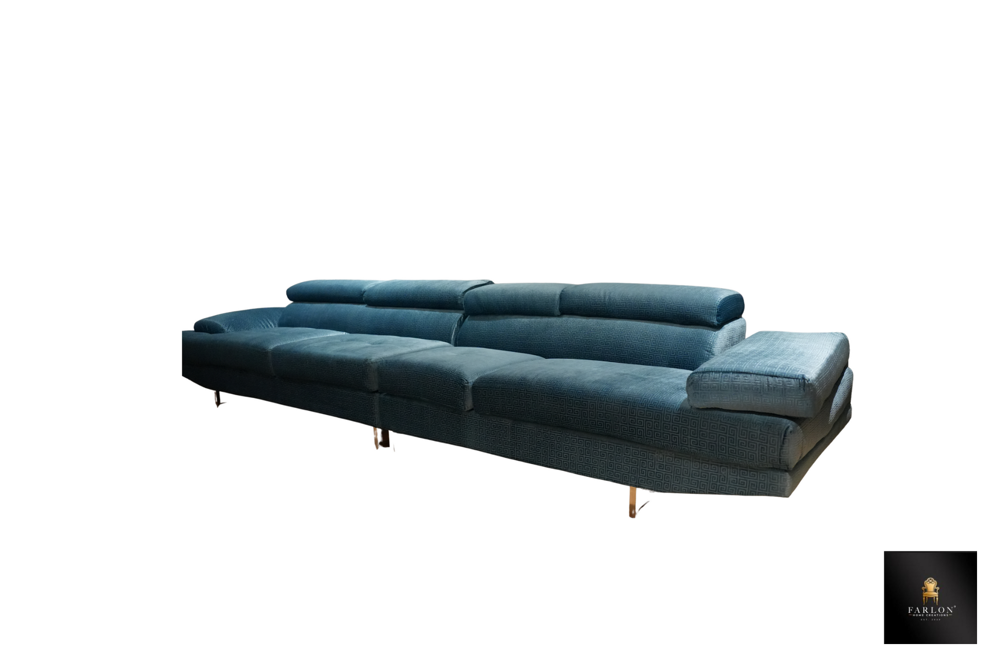 Expertly upholstered in a rich, textured deep-teal fabric, the sectional features adjustable headrests, wide plush seating, and refined geometric detailing that adds visual depth and elegance. Its expansive layout provides abundant room for lounging, entertaining, or stretching out at the end of a long day.