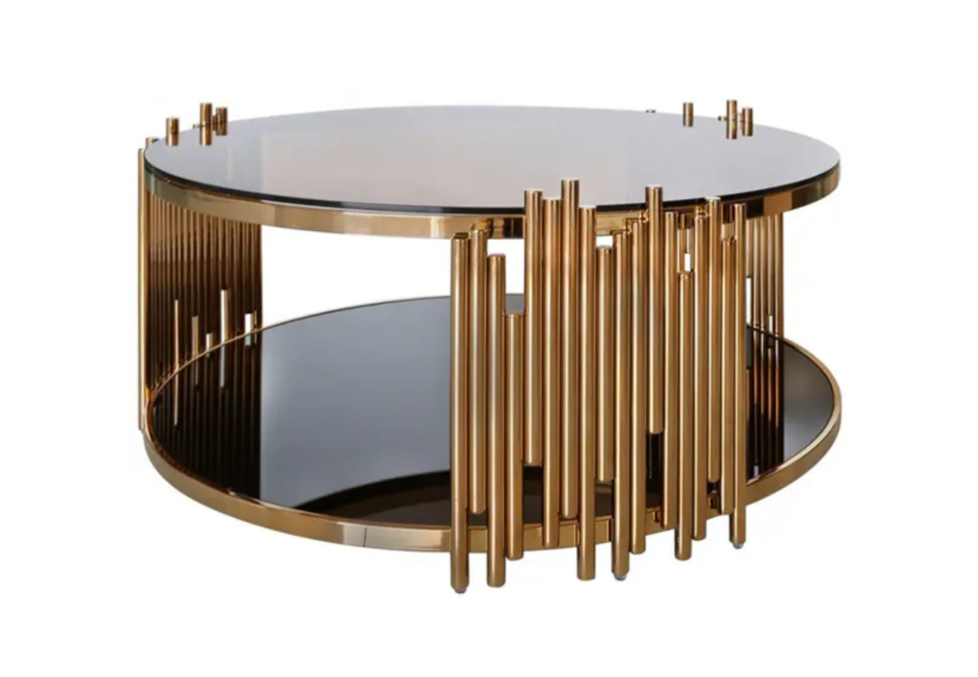 Featuring a sleek, smoked-glass tabletop paired with a matching lower shelf, the Aurora table creates a sense of depth and dimension, perfect for showcasing décor or storing your favorite coffee-table books. The eye-catching gold metal frame — composed of vertically arranged cylindrical rods — adds a bold architectural touch that instantly enhances any modern interior.